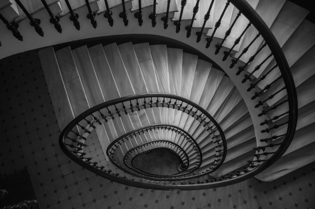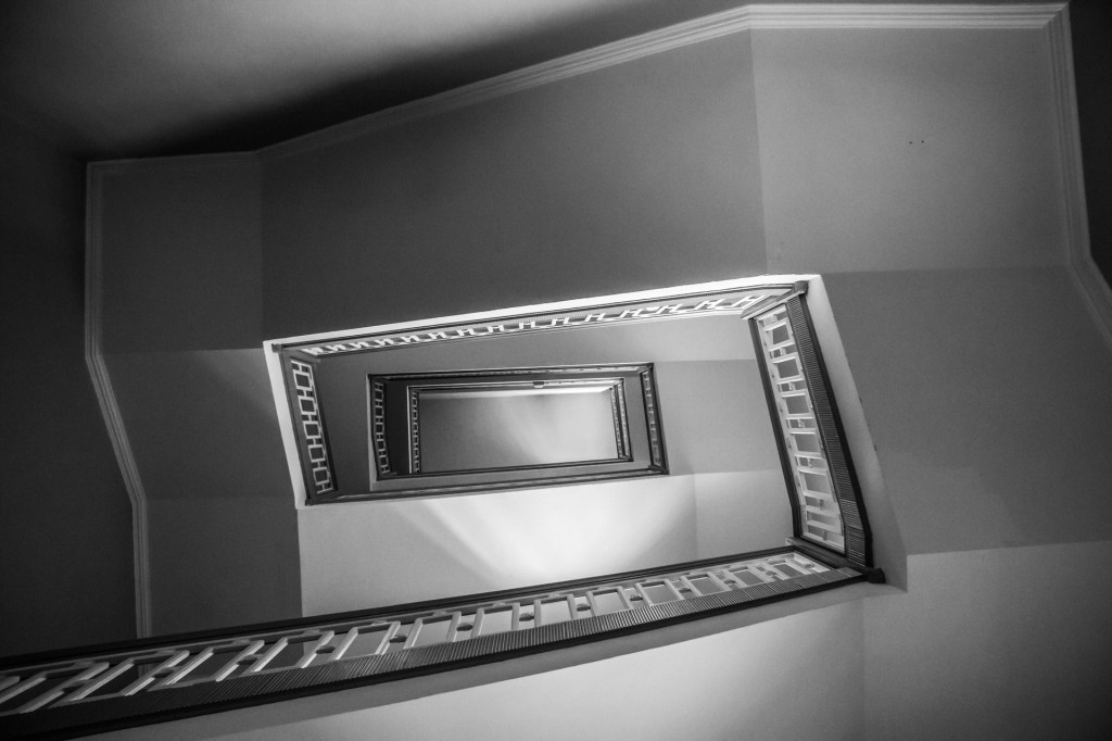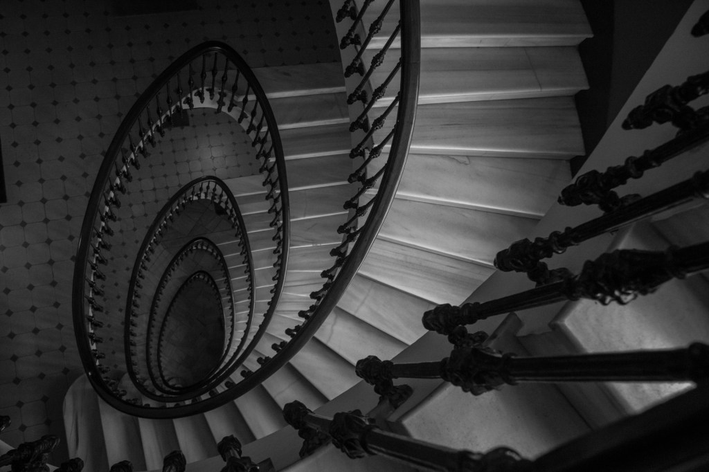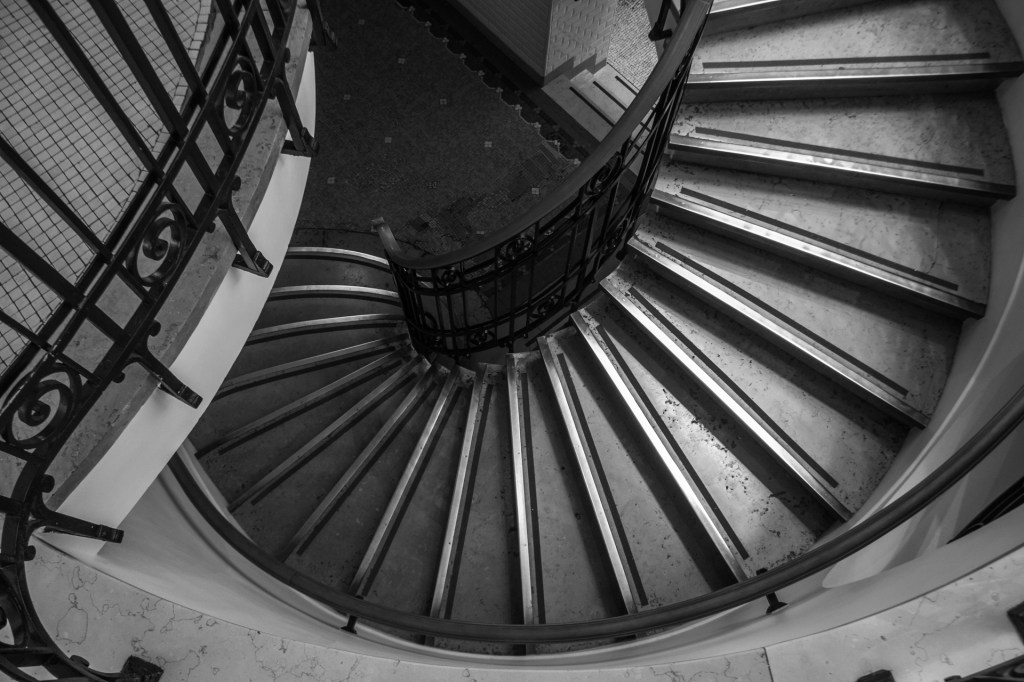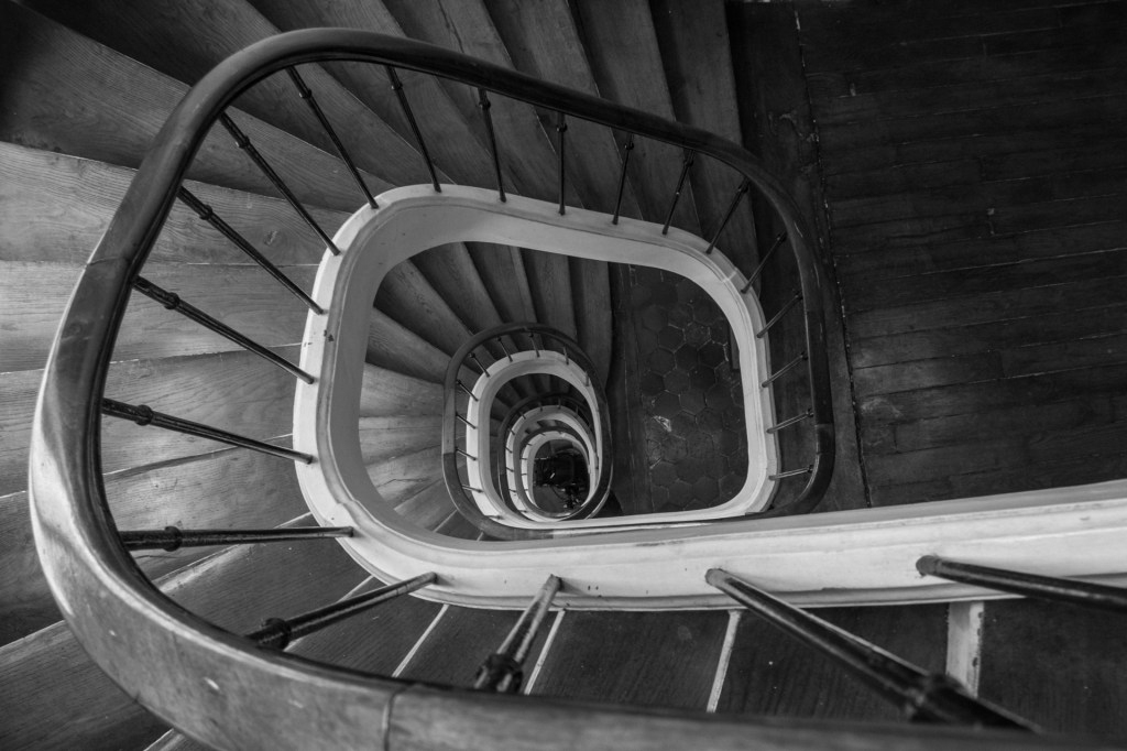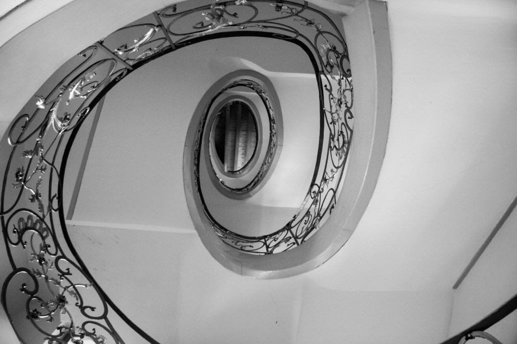 É por iso que este traballo se achega ao inicio da decadencia, cun análise de espazos que van do século XIX até mediados do SXX. Escaleiras principalmente helicoidais que pasan do artesanal ao art decó, atravesando as correntes estéticas que marcarán o desenvolvemento arquitectónico de cada época. As escaleiras retratadas, refiren ao “basso continuo” que cita na súa obra Augé, ideado por Starobinski, que utiliza para evocar “os lugares e os ritmos antigos, que non son borrados pola modernidade, senón que fican nun segundo plano. Son indicadores do tempo que pasa e que sobrevive.” Camadas de construcións en estratos coma tempos superpostos: ver un universo en simultáneo dende todos os ángulos inmersos na soidade da etoloxía humana contemporánea, capturando unha historia de paso, de perda ao longo do tempo.